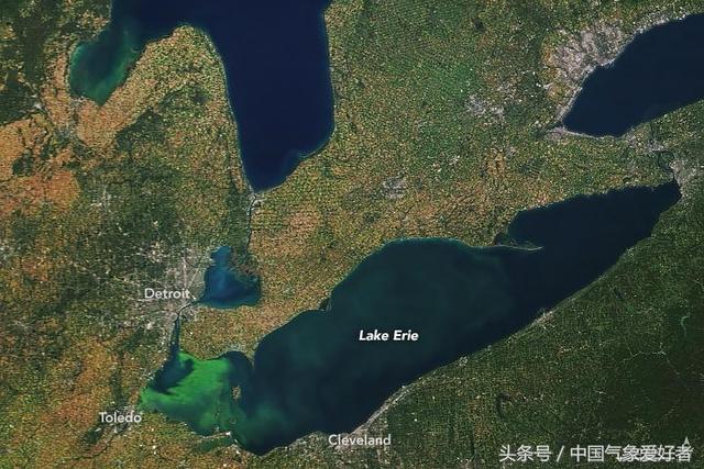 9月,五大湖地區(qū)秋天到來,當(dāng)陸地上的樹葉和莊稼呈現(xiàn)出典型的橙黃色和棕色時(shí),伊利湖的綠色仍在非常鮮明,面積持續(xù)擴(kuò)大,2017年9月24日,美國宇航局(NASA)的衛(wèi)星記錄下這一景觀,伊利湖湖區(qū)呈現(xiàn)出詭異的嫩綠色。